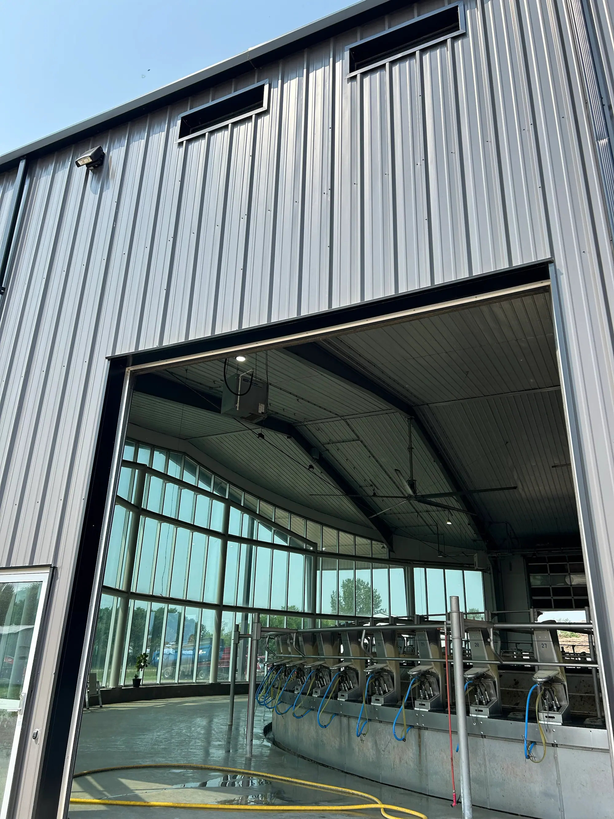 Pennwood Dairy Barn, combines modern design with functionality. Built with pre-engineered steel, it features a 80 cow rotary milking parlour and spacious holding areas, making day-to-day dairy operations efficient and smooth. The barn is thoughtfully designed to provide a comfortable environment for livestock while ensuring staff can work with ease, blending technology and care in a practical, durable space.