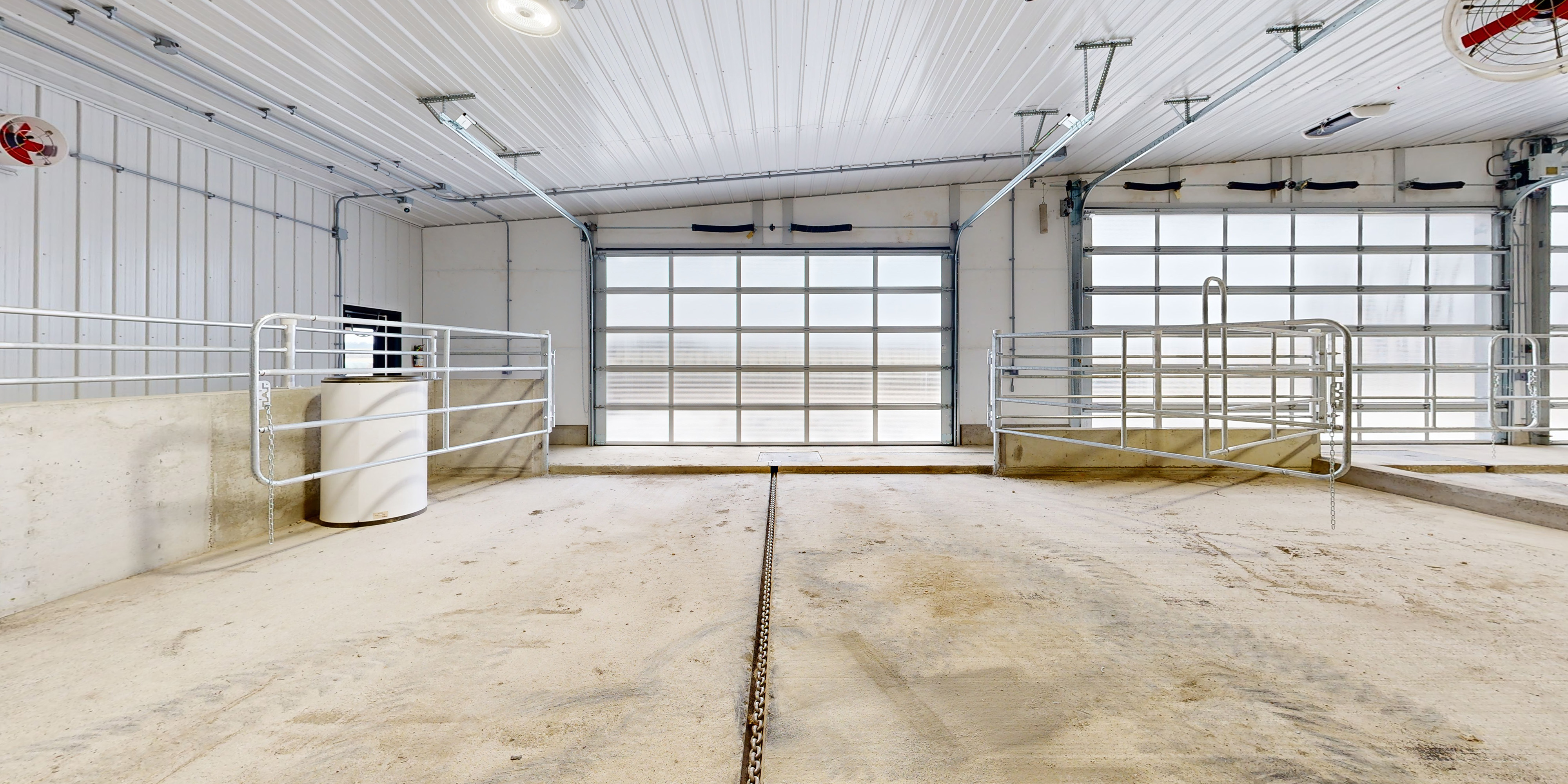 Dairy barn featuring two milking robots, tunnel ventilation, and a robotic feed pusher for efficient daily operations. The design includes waterbeds for cow comfort, a side-expandable layout for future growth, and polycarbonate doors for enhanced light and durability. Additional features include a perimeter human walkway for safe and easy access and a decorative entry canopy that adds a clean, modern exterior finish.